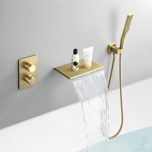 Modern Waterfall Tub Filler Deck Mounted Bathtub Tap with Handshower in Brushed Gold