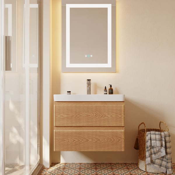 600mm Floating Bathroom Vanity With Ceramic Basin 2 Drawers Solid Wood Fluted Texture
