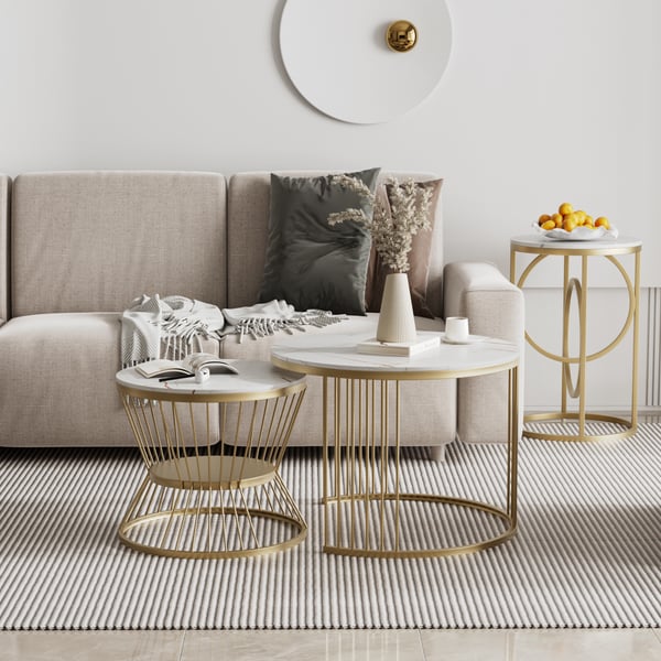 Modern Round Nesting Coffee Table Set 2-Piece Black and White Stone Top Gold Base