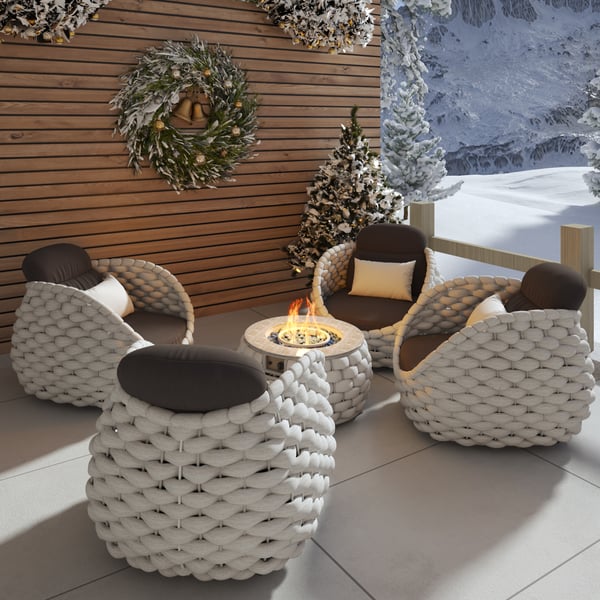 Tatta Weave Round Propane Outdoor Fire Pit & 4 Outdoor Chairs Set Woven Textilene Rope